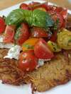 Dans une assiette, dispose ton Rösti. Ajoute la mozzarella en morceaux puis tes tomates et le persil. Ajoute une feuille de basilic.