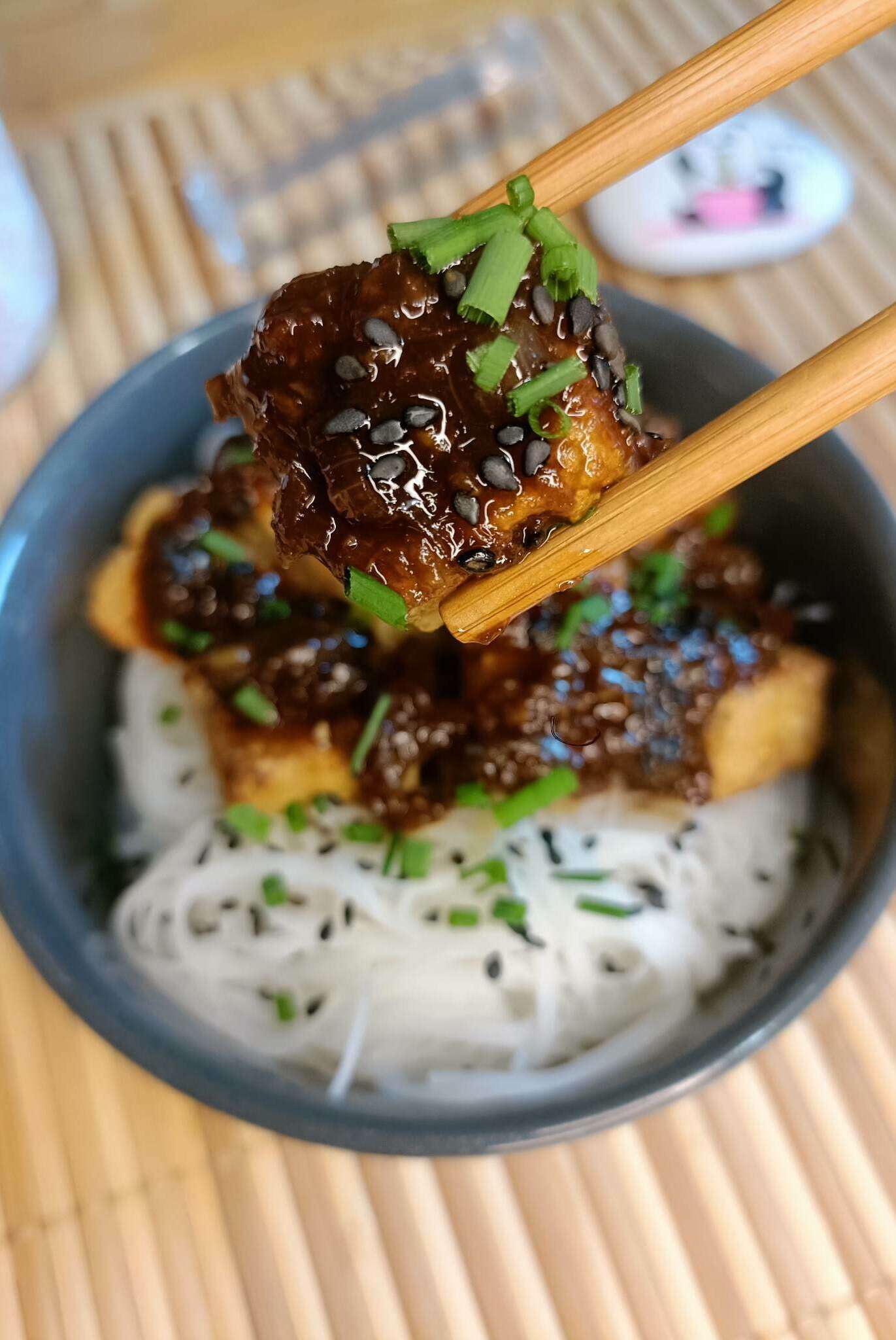 Tofu fumé - Sauce Japchae - Seitan - Protéines de Soja Texturées - Sauce Teriyaki au caramel - Egrené veggie