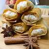 Étape 6 : les bandelettes. Badigeonne au pinceau une feuille filo du beurre vanillé. Remet en une par dessus et réserve. Refait la même chose avec 2 pâtes filo. Découpe dans chaque pâte 8 bandelettes dans le sens de la largeur.